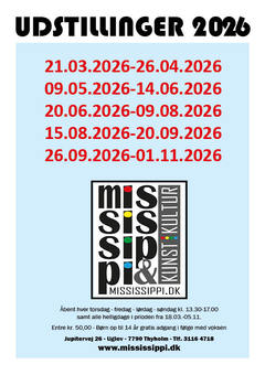 Mississippi - vestjyllands nye kunst- og kulturcenter med løbende udstillinger af 5-8 kunstnere på hver udstilling.